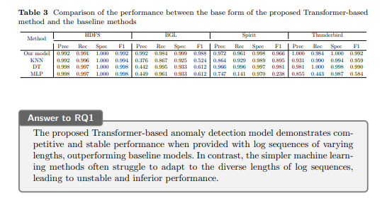 In this research question, we evaluate the base form of the proposed Transformerbased model, which is trained without positional and temporal encoding against the baselines. According to a recent study [23], simple models can outperform complex DL ones in anomaly detection in both time efficiency and accuracy. The superior results achieved by sophisticated DL methods turn out to be misleading due to weak baseline comparisons and ineffective hyperparameter tuning. Hence, in this study, we employ simple machine learning methods, including K-Nearest Neighbor (KNN), Decision Tree (DT), and Multi-layer Perception (MLP) as baselines as in Yu et al.’s work [23]. We use the MCV as the input feature for the baseline models. We additionally conduct a grid search on the hyperparameters to strive for optimal performance for the baseline models. For the HDFS dataset, we use the Block ID to group the logs into sessions. For the datasets without a grouping identifier, the samples in the training and test sets are of varying lengths generated according to the process explained in Section 4.3.