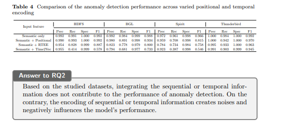 In this research question, we utilize semantic embedding (generated with all-MiniLML6-v2 [26]) and random embedding to encode log events. The random embedding generates a unique feature vector for each log event. Therefore, when served only with random embedding, the model can only detect anomalies with the occurrence of log events in log sequences. That is to say, the model has no access to the anomalous information possibly provided by the semantics of the log messages. By comparing the performance of models using these two input features, we can grasp the significance of semantic information in the anomaly detection task. Moreover, we input only the temporal encoding to the model without the semantic embedding of the log events, with the aim of determining the degree to which anomalies can be detected solely by leveraging the temporal information provided by the timestamps of logs. We conduct the experiments with the two temporal encoding methods as in RQ2.
