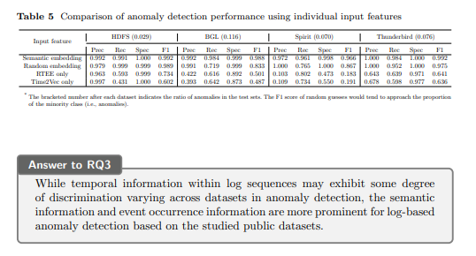 5.3.1 Objective From the RQ2, we find that the sequential and temporal information does not contribute to the performance of the anomaly detection model on the datasets. On the contrary, the encoding added to the semantic embedding may induce information loss for the Transformer-based model with the studied datasets. In this research question, our objective is to further analyze the different types of information associated with the anomalies in studied datasets. We aim to check how much semantic, sequential, and temporal information independently contributes to the identification of anomalies. This study may offer insight into the characteristics of anomalies within the studied datasets.
