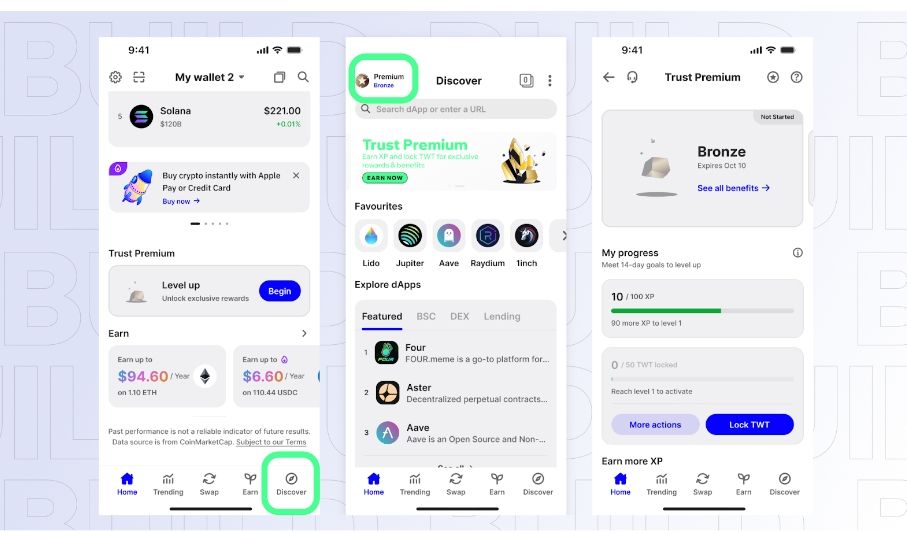 With Trust Premium, users earn Trust XPs from everyday actions in Trust Wallet and progress through Bronze → Silver → Gold tiers. Holding or locking TWT strengthens and maintains higher tiers, unlocking immediate, in-wallet benefits such as gas and fee savings, and soon exclusive access to Trust Alpha, campaigns and airdrops, and evolving partner rewards.