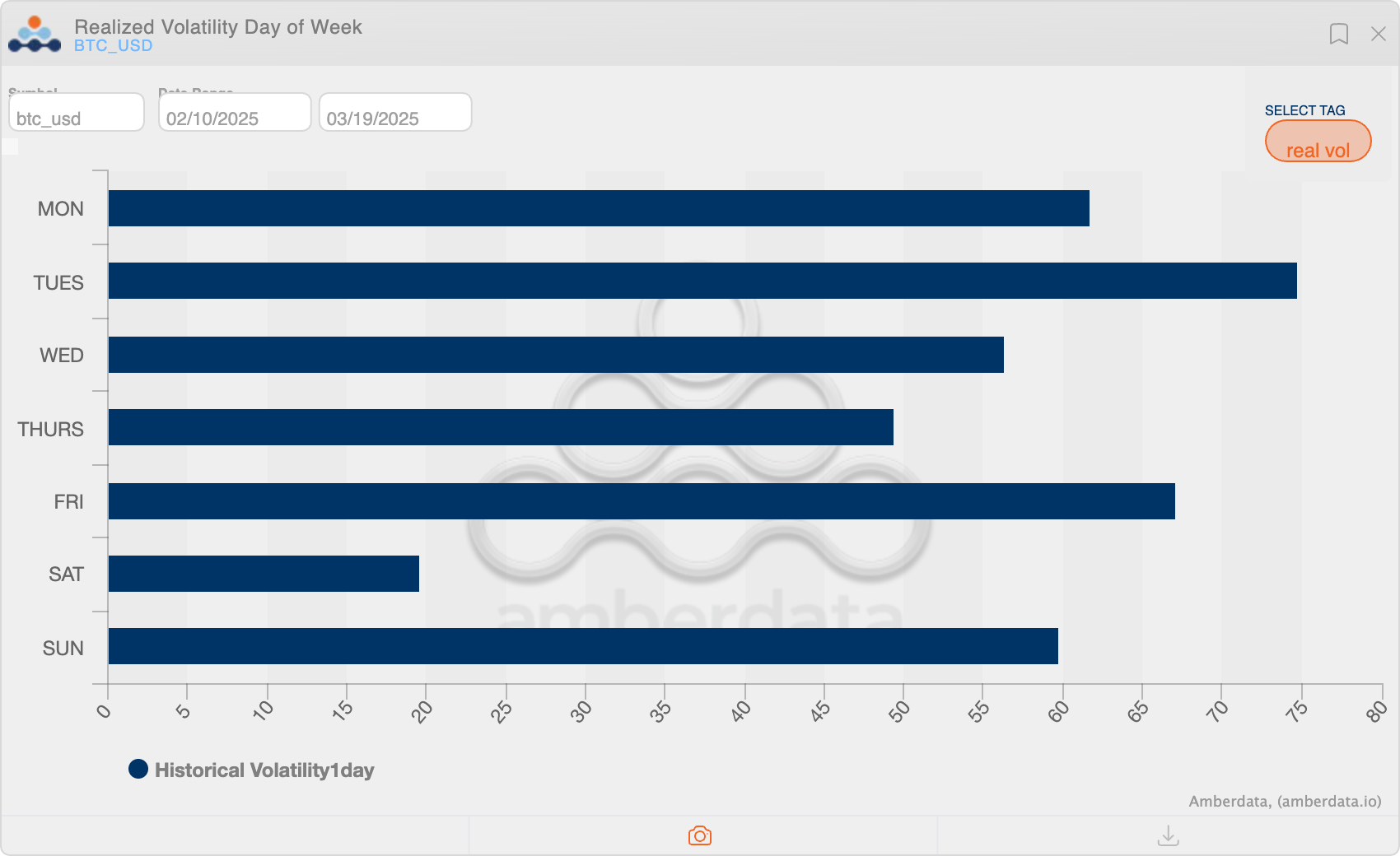 According to Amberdata, Tuesdays have been the most volatile day of the week thus far in 2025, particularly over the past month, where realized volatility has averaged 82.