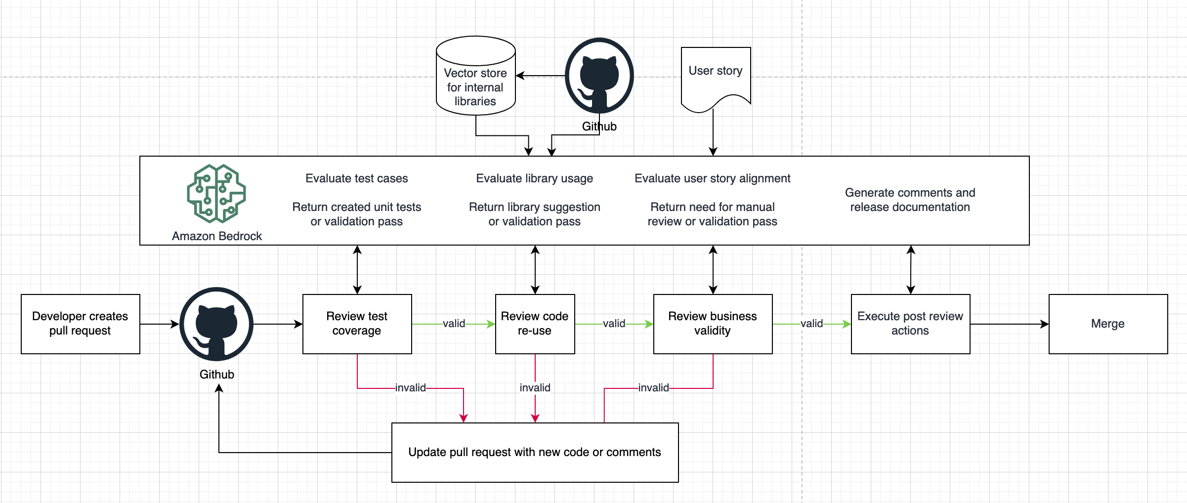 The following process architecture proposes an example SDLC flow that incorporates generative AI in key areas to improve the efficiency and speed of development.