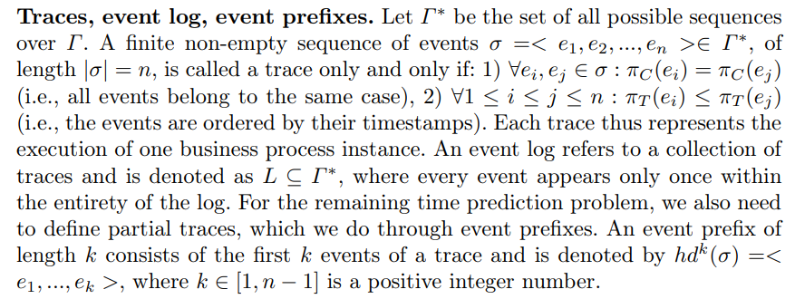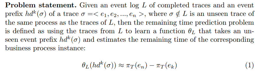 The structure of the paper is outlined as follows: Section 2 covers background and related work, Section 3 presents preliminary concepts, Section 4 introduces our proposed approach for remaining time prediction, Section 5 discusses the experimental setup and key findings, and finally, Section 6 summarizes our contributions and suggests future research directions.