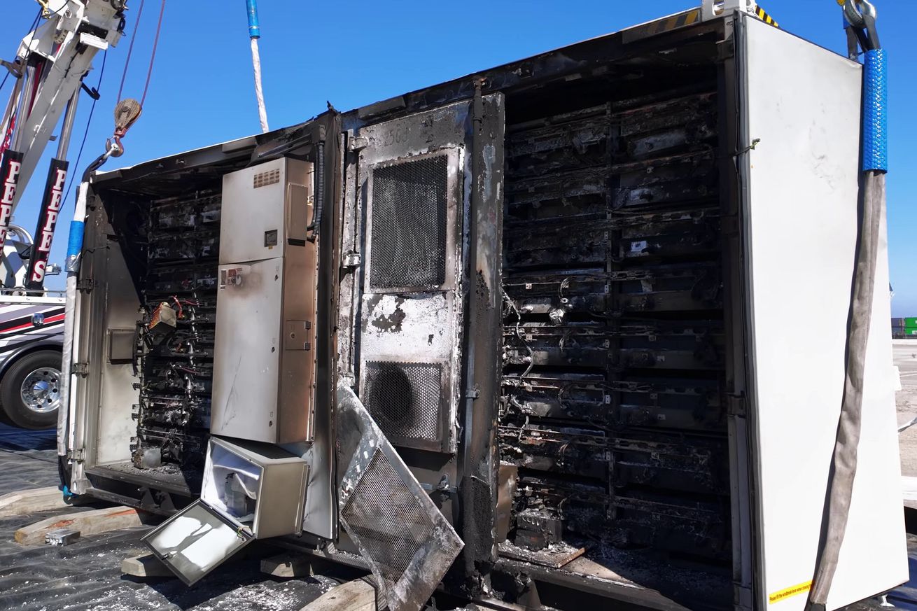 Pepe’s Tow Service owner Josh Acosta uploaded a lengthy video today chronicling the point of explosion, the long wait as the Fire Department let the batteries burn, and the process of lifting the container full of burnt batteries to transport. In the video, we see what looks like stacks of batteries with liquid cooling pipes between each layer.