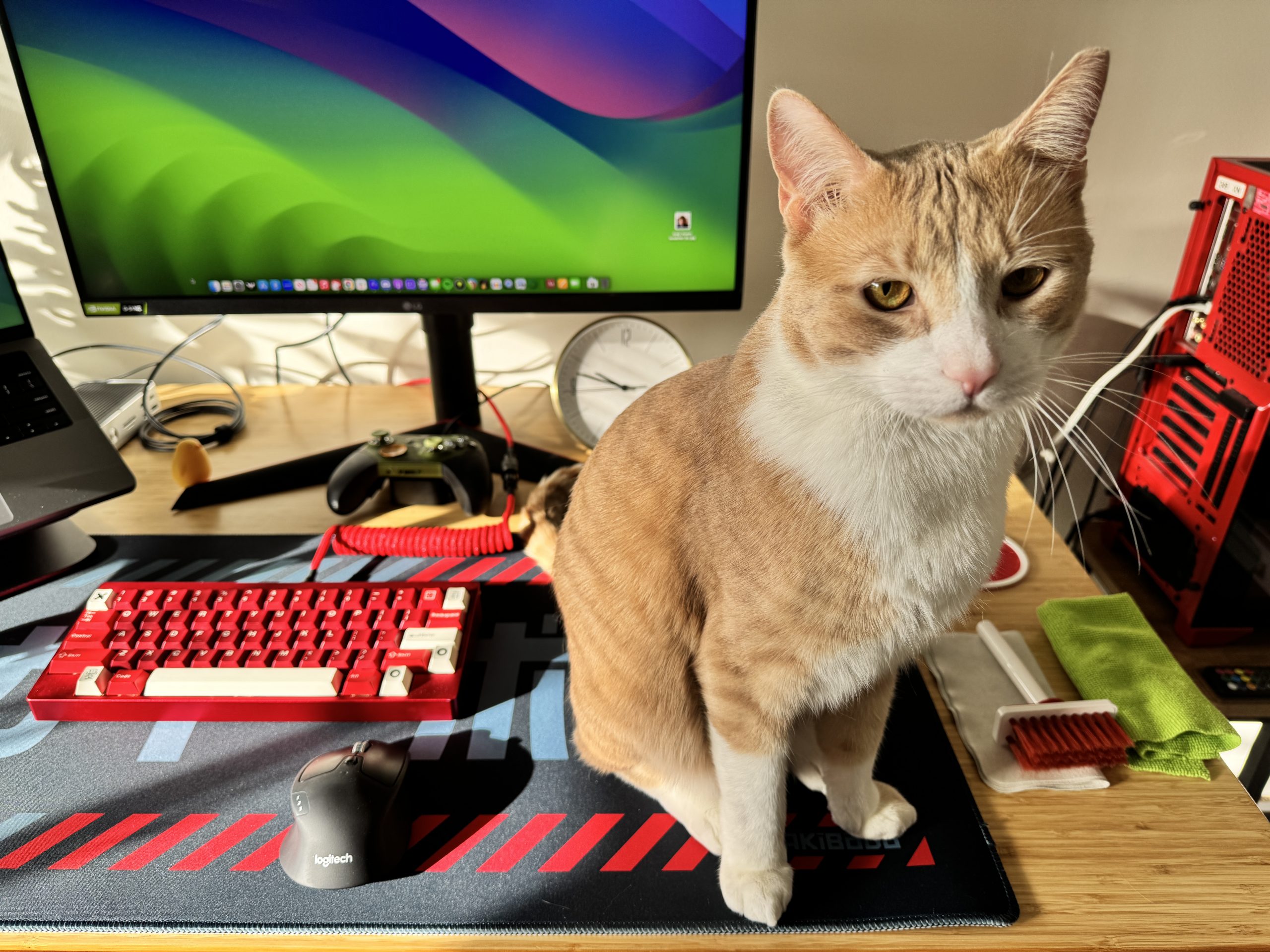 It cost more than I’d like to admit and took forever to arrive, but I’ve used it daily for four years now and still really enjoy it. I’ve done a few customizations, mostly installing NovelKeys Cream switches and quieter stabilizers, and I’ve swapped out the keycaps quite a few times before landing on my most recent ones. I also paired it with a matching red USB-C cable from the peripheral company Glorious.
