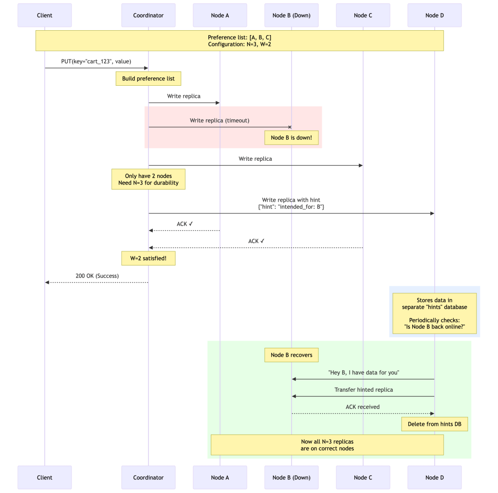 Important nuance: While Dynamo is often described as an AP system, it’s more accurate to call it a tunable consistency system. Depending on your R and W quorum configuration, it can behave closer to CP. The AP label applies to its default/recommended configuration optimized for e-commerce workloads.