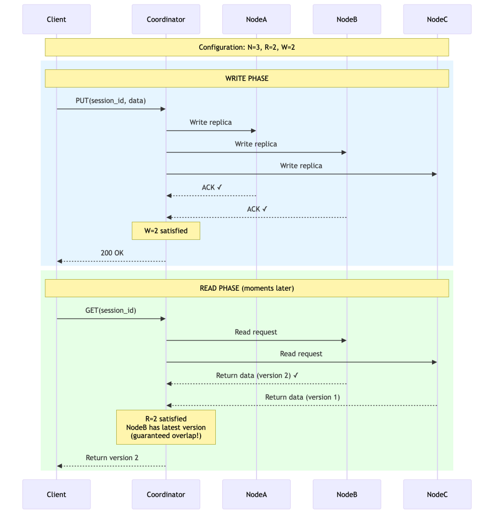 - R=1: Read from any single node. Stale session data is harmless.
