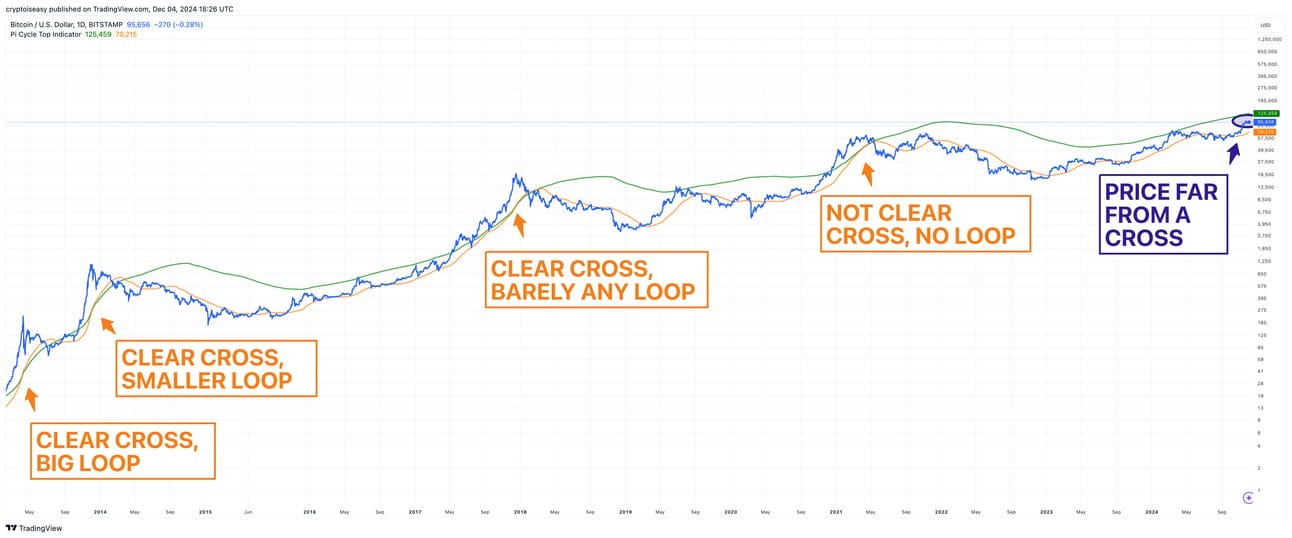 We are already much higher on traditional on-chain metrics than in past instances where the Pi Cycle has reached a comparable level. Which will be wrong — the metrics or the Pi Cycle?