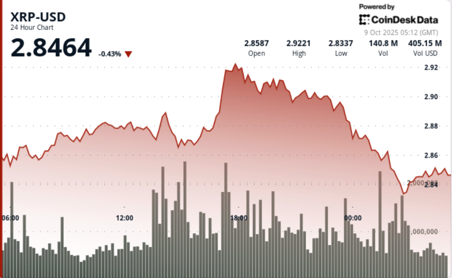 - XRP settled at $2.851, down 2.5% from intraday highs.