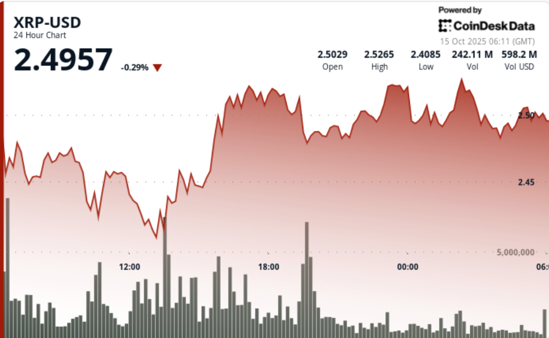 - XRP traded sharply lower through the October 14–15 session as macro pressure and broad crypto deleveraging sent open interest down 50% to $4.22 billion.