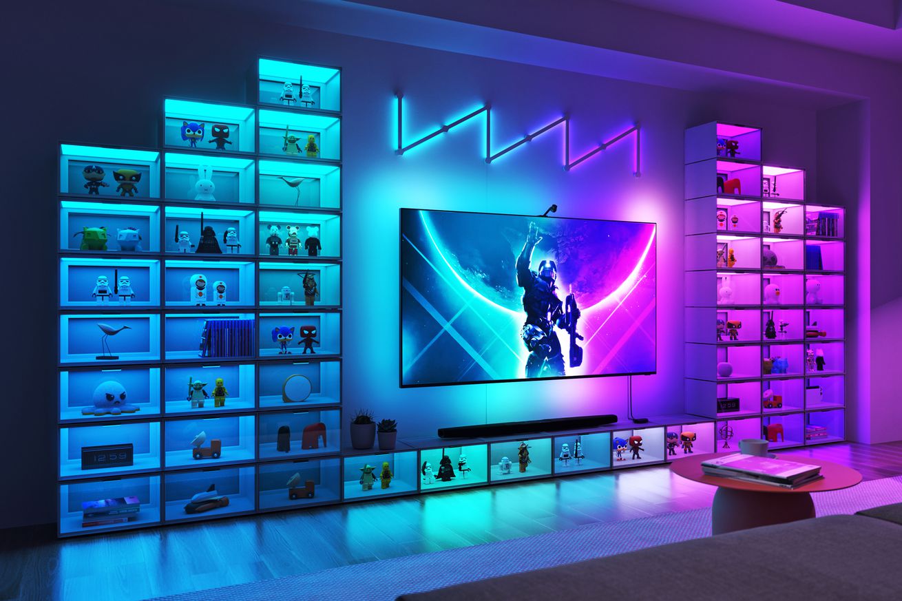 You can fill an entire wall with Nanoleaf’s new glowing display cases, which simply need to stack to connect to each other. | Image: Nanoleaf