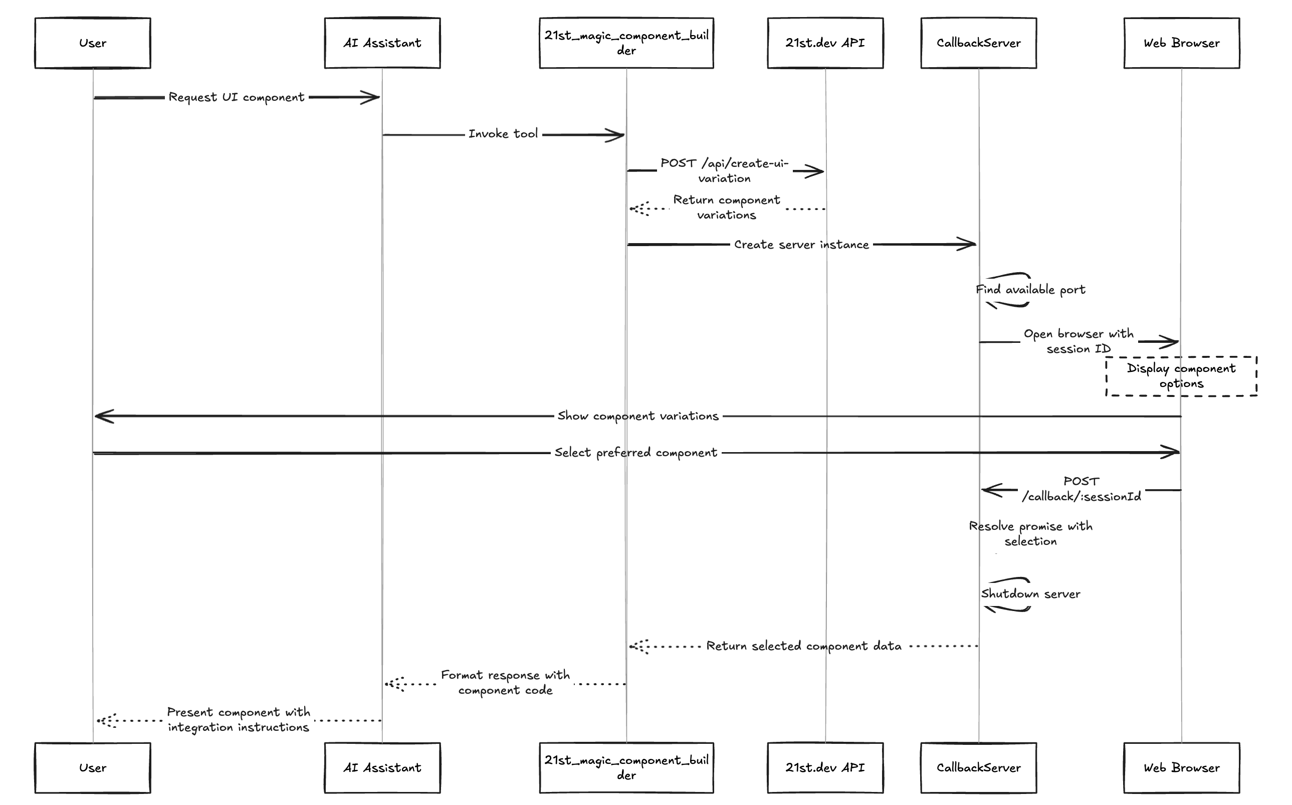 - Tool Invocation: The AI assistant invokes the 21stmagiccomponent_builder tool when a user requests a new UI component.