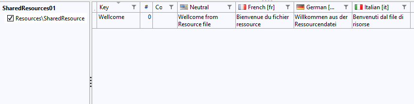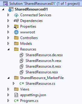 In the folder “Resources” create your language resources files, and make sure you name them SharedResources.xx.resx.